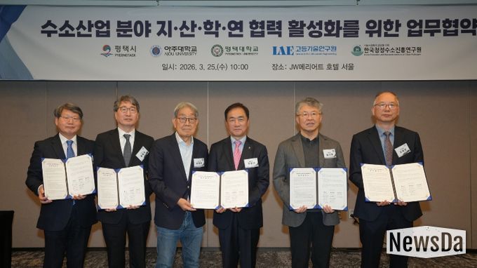 뉴스다 최광묵 기자 | 평택시는 25일, 아주대학교·평택대학교·고등기술연구원·한국청정수소진흥연구원과 '수소산업 분야 지산학연 협력 활성화를 위한 업무협약(MOU)'을 체결했다고 밝혔다.