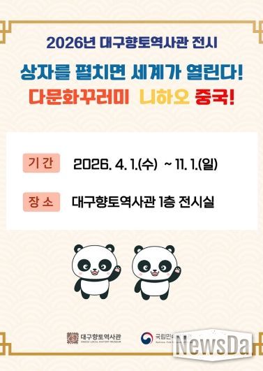 뉴스다 최광묵 기자 | 대구문화예술진흥원 박물관운영본부 소속 대구향토역사관은 국립민속박물관이 주관하는 ‘2026 다문화꾸러미 대여 운영’ 공모사업에 선정되어, 올해 중국 다문화꾸러미를 활용한 다양한 사업을 운영한다.