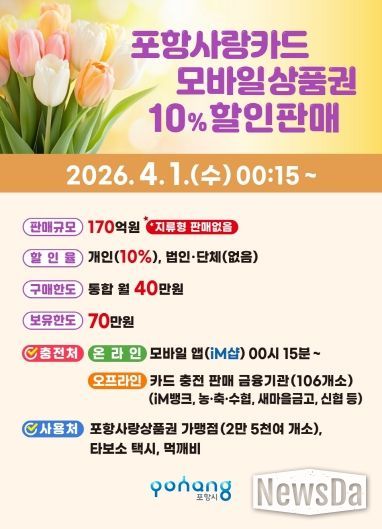 뉴스다 최광묵 기자 | 포항시가 지역 경제에 활력을 불어넣기 위해 내달 1일부터 카드형·모바일 포항사랑상품권(포항사랑카드) 170억 원을 10% 할인된 금액으로 판매한다.