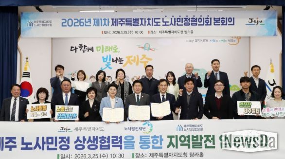 제주특별자치도는 25일 도청 탐라홀에서 2026년 제1차 제주노사민정협의회 본회의를 열어 ‘산업대전환 대응과 일터 위험격차 해소를 위한 제주특별자치도 노사민정 공동선언문’을 채택하고, 노사발전재단과 상생협력 업무협약을 체결했다.