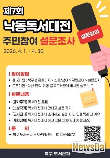 뉴스다 최광묵 기자 | 부산 북구는 오는 4월 1일부터 30일까지 한 달간 2026년 제7회 낙동독서대전 개최를 위한 구민 의견수렴 설문조사를 실시한다고 밝혔다.