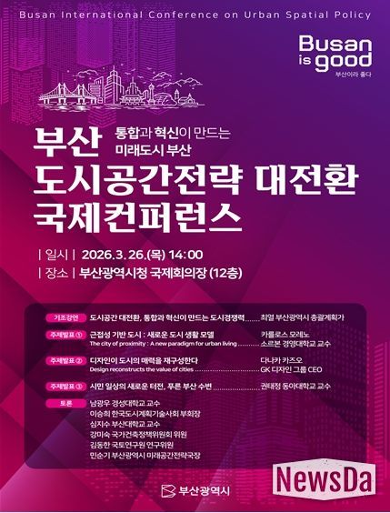 뉴스다 최광묵 기자 | 부산시는 26일 오후 2시 시청 국제회의장에서 '부산 도시공간전략 대전환 국제컨퍼런스'를 개최한다고 밝혔다.