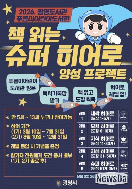 뉴스다 최광묵 기자 | 광명시 광명도서관은 어린이들의 자발적인 독서 습관 형성과 도서관 이용 활성화를 위해 3월부터 푸름이어린이도서관에서 ‘책 읽는 슈퍼 히어로(Hero)’ 성장 프로젝트를 계속 운영한다.
