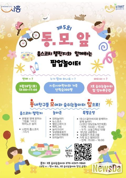 뉴스다 최광묵 기자 | 시흥시는 아동의 건강한 놀이문화 환경을 조성하고 자유놀이에 대한 인식을 확산하기 위해 오는 3월 28일 오후 1시부터 5시까지 ‘3호 숨쉬는놀이터’와 ‘성마루공원’ 일대에서 ‘팝업놀이터 동·모·앞 5탄’을 개최한다.