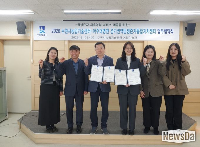 뉴스다 최광묵 기자 | 수원특례시와 아주대병원 경기권역암생존자통합지지센터는 25일 농업기술센터 2층 세미나실에서 ‘암 생존자 치유농업 서비스 제공을 위한 업무협약’을 체결하고, 협력을 약속했다.