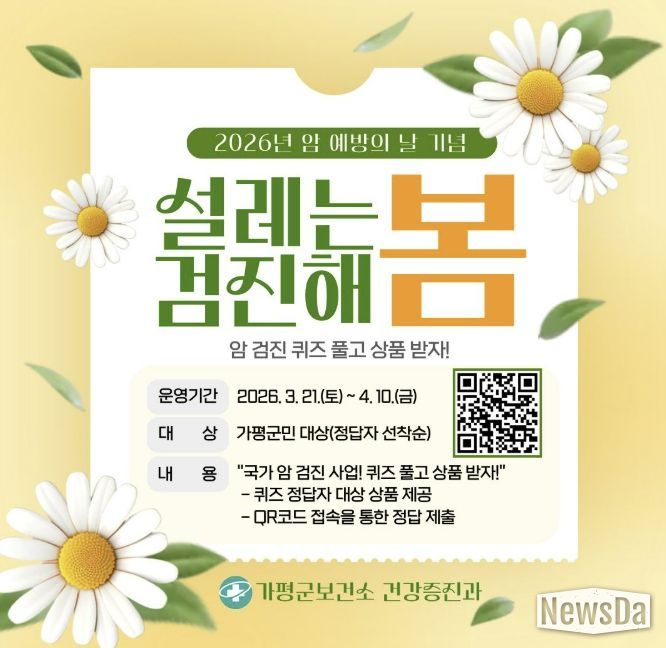 뉴스다 최광묵 기자 | 가평군은 ‘암 예방의 날(3월 21일)’을 기념해 군민의 암 검진 참여를 독려하기 위한 ‘암 검진 퀴즈 이벤트’를 진행하고 있다.