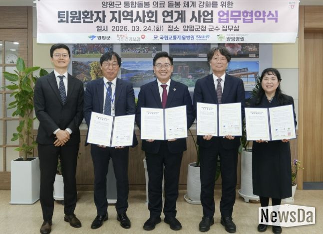 뉴스다 최광묵 기자 | 양평군은 지난 24일 군수실에서 국민건강보험공단 양평지사, 국립교통재활병원, 양평병원과 ‘퇴원환자 지역사회 연계 사업’ 추진을 위한 업무협약을 체결하고 의료·돌봄 통합체계 구축에 나섰다고 밝혔다.