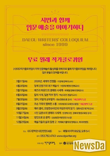 뉴스다 최광묵 기자 | (사)대구작가콜로퀴엄이 대구문학관과 함께 3월 31일부터 매월 마지막 화요일 오후 5시에 ‘무료 월례 작가콜로퀴엄’을 진행한다.