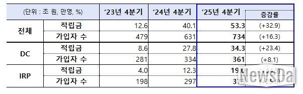 사전지정운용제도(디폴트옵션)는 확정기여형퇴직연금(DC) 및 개인형퇴직연금(IRP) 가입자가 운용지시를 하지 않는 경우 사전에 정한 방법으로 퇴직연금을 운용하는 제도로, ’23.7월부터 시행되어 뚜렷한 증가세를 보이며 ’25년 4분기 기준 적립금 53조 원, 734만 명의 가입자를 보유하고 있다.