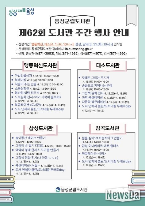 뉴스다 최광묵 기자 | 음성군립도서관(맹동혁신,대소,삼성,감곡)에서는 제62회 도서관 주간을 맞이해 오는 4월 12일부터 ‘도서관 속 작은 펼침, 세상을 여는 큰 열림’이라는 주제로 음성군립도서관 이용자 대상 각종 독서·문화 행사를 개최한다.