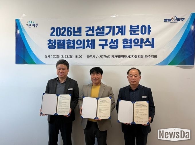뉴스다 최광묵 기자 | 파주시는 지난 23일 ㈔건설기계개별연명사업자협의회 파주지회와 ‘건설기계 분야 청렴협의체’구성을 위한 협약식을 개최하고, 공정하고 책임 있는 행정 구현을 위한 공동 실천을 약속했다.