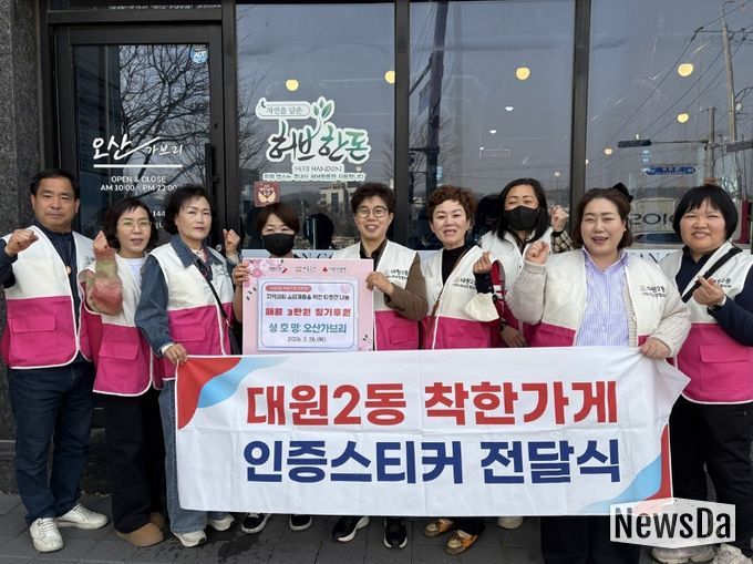 뉴스다 최광묵 기자 | 오산시 대원2동 행정복지센터는 지난 26일 지역사회 나눔문화 확산을 위해 ‘오산가브리’를 대원2동 착한가게 13호점으로 지정하고 인증 스티커 전달식을 진행했다고 밝혔다.