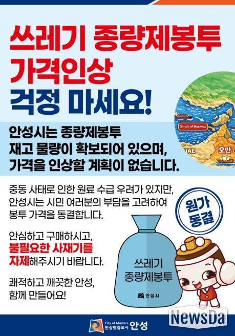 뉴스다 최광묵 기자 | 안성시는 최근 국제 유가 상승과 원자재 수급 불안 우려에도 불구하고 종량제봉투 가격을 인상하지 않고 안정적인 공급 체계를 유지하고 있다고 26일 밝혔다.