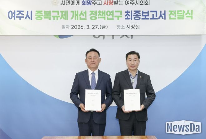 여주시의회는 3월 27일 오전 시장실에서 '여주시 중복규제 개선 정책연구' 최종보고서 전달식을 개최했다고 밝혔다. 이날 전달식에는 이충우 여주시장을 비롯한 집행부 관계자와 여주시의회 박두형 의장, 연구수행기관 관계자 등이 참석해 연구결과를 공유하고 정책 반영 방안을 논의했다.