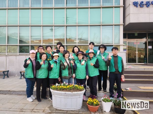 이번 행사에는 동 직원과 주민 등 30여 명이 참여해 학온동 행정복지센터 청사 앞 화단에 비올라, 팬지, 데이지 등 봄꽃 200여 본을 심었다.