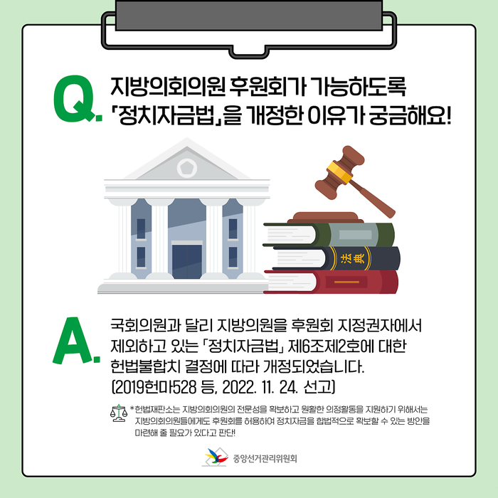 A. 국회의원과 달리 지방의원을 후원회 지정권자에서 제외하고 있는「정치자금법」 제6조제2호에 대한 헌법불합치 결정에 따라 개정되었습니다. (2019헌마528등, 2022. 11. 24. 선고)