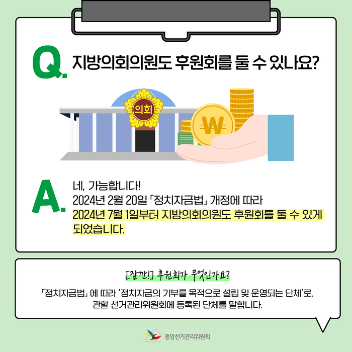 A. 가능합니다! 2024년 2월 20일 「정치자금법」 개정에 따라 2024년 7월 1일부터 지방의회의원도 후원회를 둘 수 있게 되었습니다.