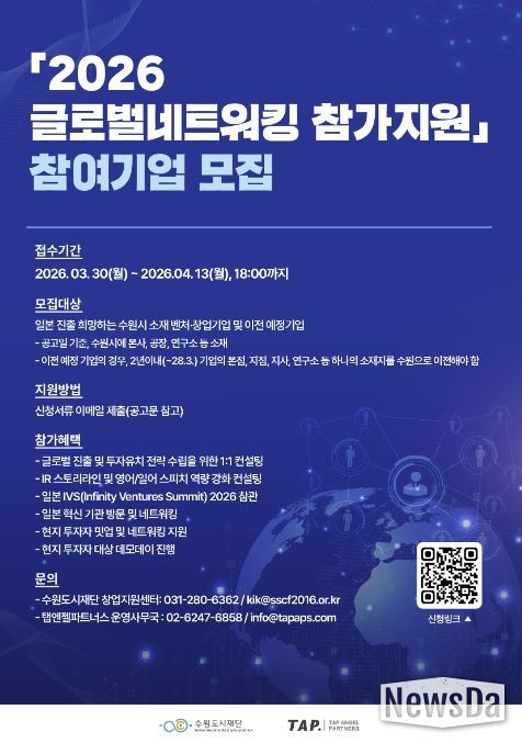 뉴스다 최광묵 기자 | 수원특례시가 ‘2026 글로벌네트워킹 참가지원’에 참여할 벤처·창업 기업 7개사를 3월 30일부터 4월 13일까지 모집한다.