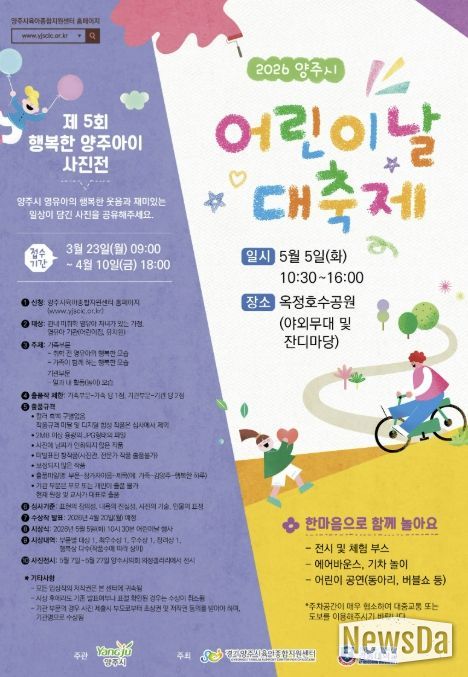 신청 대상은 영유아 자녀를 둔 가정과 어린이집이며 접수 기간은 오는 4월 10일까지이다. 수상작 발표는 4월 20일 예정으로 시상은 5월 5일 어린이날 행사 기념식에서 진행되며 5월 7일부터 5월 27일까지 양주시의회 의정갤러리에서 전시 예정이다.