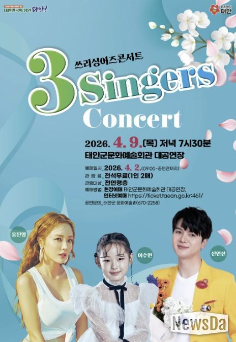 뉴스다 최광묵 기자 | 태안군이 4월 9일 태안군문화예술회관 대공연장에서 홍진영 등 유명 가수가 출연하는 ‘3-Singers 콘서트’를 개최한다.