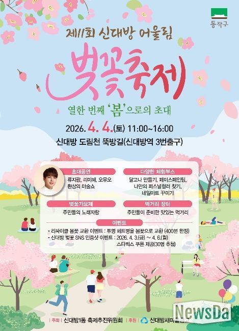 먼저, 올해로 11회째를 맞는 ‘신대방 어울림 벚꽃축제’는 오전 11시부터 오후 4시까지 신대방역 3번 출구 인근 도림천 뚝방길에서 열린다.
