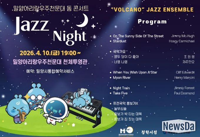 뉴스다 최광묵 기자 | 밀양문화관광재단은 오는 4월 10일 밀양아리랑우주천문대 천체투영관에서 우주와 음악이 결합한 특별한 문화 행사 ‘재즈 나이트(Jazz Night)’를 개최한다.