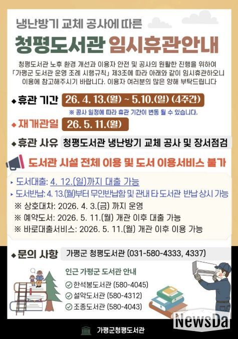 뉴스다 최광묵 기자 | 가평군 청평도서관이 대대적인 냉난방 시설 교체 공사를 위해 4월 13일부터 5월 10일까지 약 한 달간 임시 휴관에 들어간다.