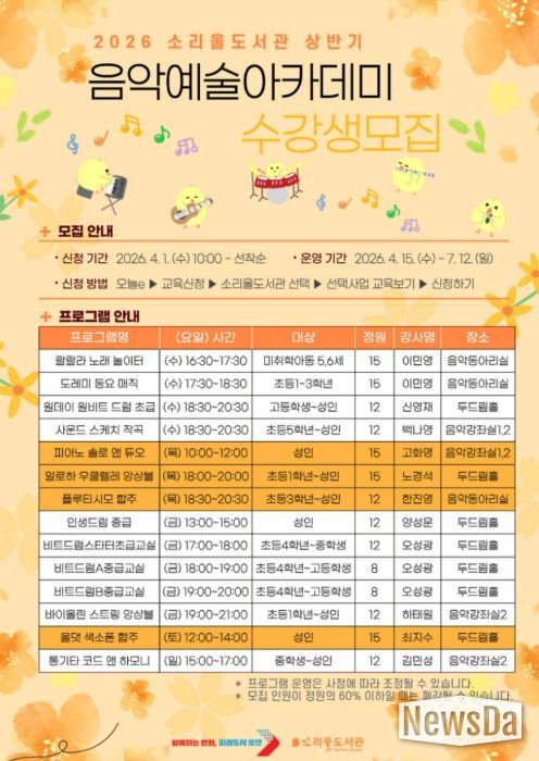 뉴스다 최광묵 기자 | 오산시 소리울도서관은 시민들의 예술적 감수성을 높이고 일상 속 음악 문화를 확산하기 위해 ‘2026년 소리울도서관 상반기 음악예술아카데미’ 수강생을 모집한다고 밝혔다.