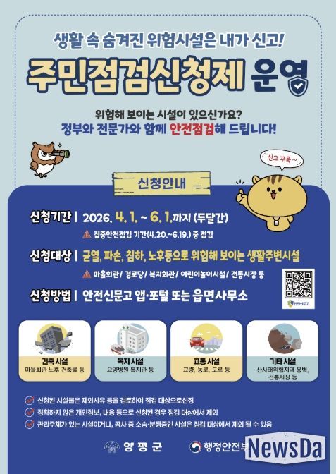 뉴스다 최광묵 기자 | 양평군은 군민의 눈높이에서 지역 사회의 안전 사각지대를 해소하기 위해 ‘2026년 집중안전점검 주민점검신청제’를 본격 운영한다고 밝혔다.