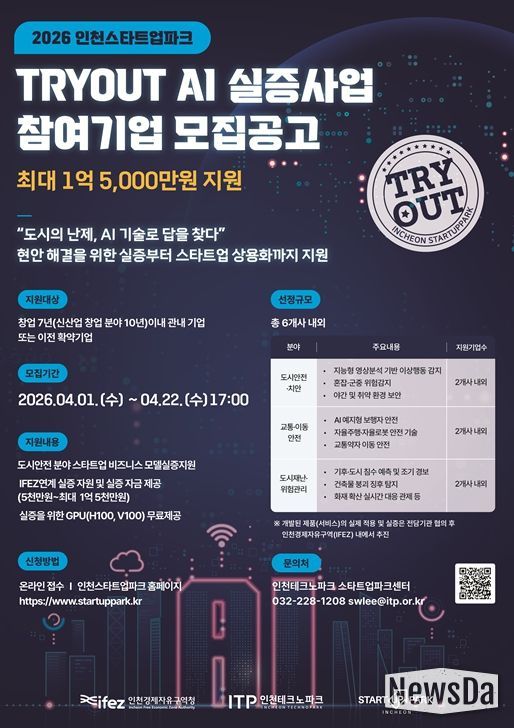 뉴스다 최광묵 기자 | 인천경제자유구역청은 도시 현장에서 AI 기술을 검증하고 상용화까지 연계하는 ‘TRYOUT AI 실증사업’ 참여 스타트업을 공개 모집한다고 밝혔다.