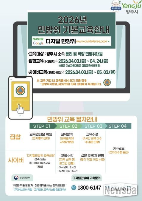 뉴스다 최광묵 기자 | 양주시가 오는 4월 3일부터 모든 민방위대원을 대상으로 민방위 기본교육을 실시한다.