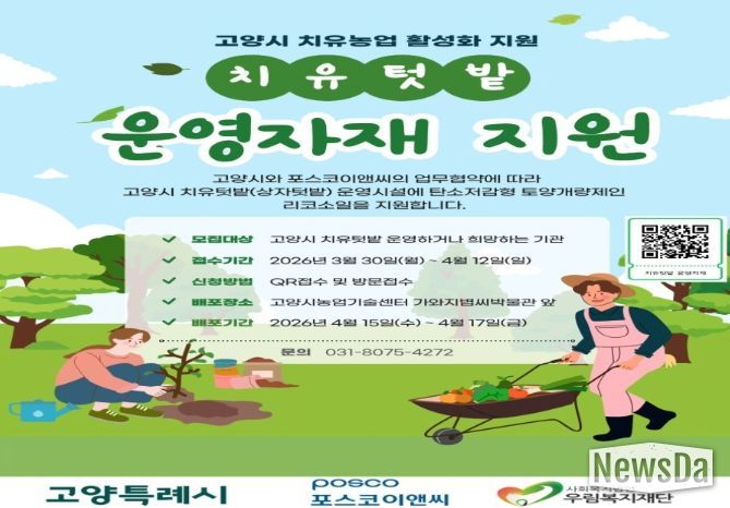 뉴스다 최광묵 기자 | 고양특례시는 시민의 정서 안정과 건강 증진을 위한 '치유텃밭 운영자재 지원사업' 참여기관을 4월 12일까지 모집한다.