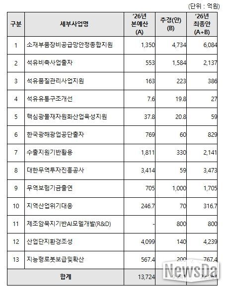 산업통상부는 중동전쟁 위기 극복을 위해 금번 추가경정예산안에 ▲석유·핵심 전략자원의 공급망 안정화, ▲수출기업 비용 경감 및 석유화학 등 피해산업 지원, ▲제조 AX 대전환 등 3대 분야, 총 9,241억원을 편성했다.