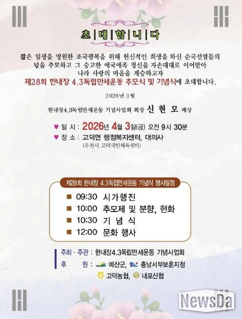 뉴스다 최광묵 기자 | 예산군은 4월 3일 고덕면 한내장터 일원에서 ‘제28회 한내장 4·3 독립만세운동 기념행사’를 개최한다고 밝혔다.