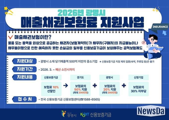 지원 대상은 광명시에 본사 또는 주사업장을 둔 당기 매출액 500억 원 미만 중소기업이다. 보험에 가입한 기업은 추후 거래처로부터 대금을 회수하지 못할 경우 손실금의 최대 80%까지 보상받을 수 있다.