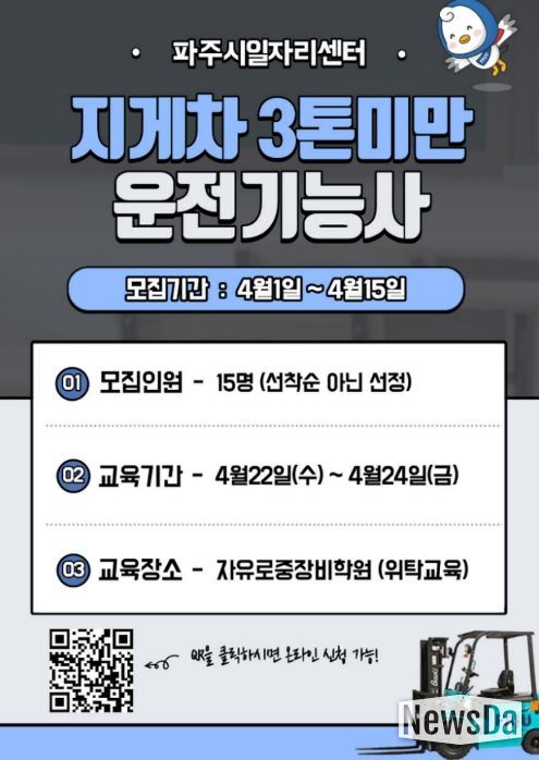 뉴스다 최광묵 기자 | 파주시는 4월 1일부터 4월 15일까지 관내에 거주하는 중장년층 구직자를 대상으로 ‘지게차(3톤 미만) 운전기능사’취업지원 프로그램 참여자 15명을 모집한다고 밝혔다.
