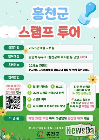 뉴스다 최광묵 기자 | 홍천군이 봄철 관광객 맏이에 나선다. 홍천군은 4월부터 11월까지 관광객을 대상으로 ‘2026 홍천군 도장 찍기 여행(스탬프 투어)’를 운영한다고 밝혔다.