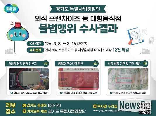 뉴스다 최광묵 기자 | 경기도 특별사법경찰단은 지난 3월 3일부터 16일까지 도내 외식 프랜차이즈 등 대형음식점 120개소를 대상으로 집중 수사를 실시한 결과 영업장 면적 변경 미신고 및 영업자 준수사항 위반 등 총 12건의 불법행위를 적발했다.