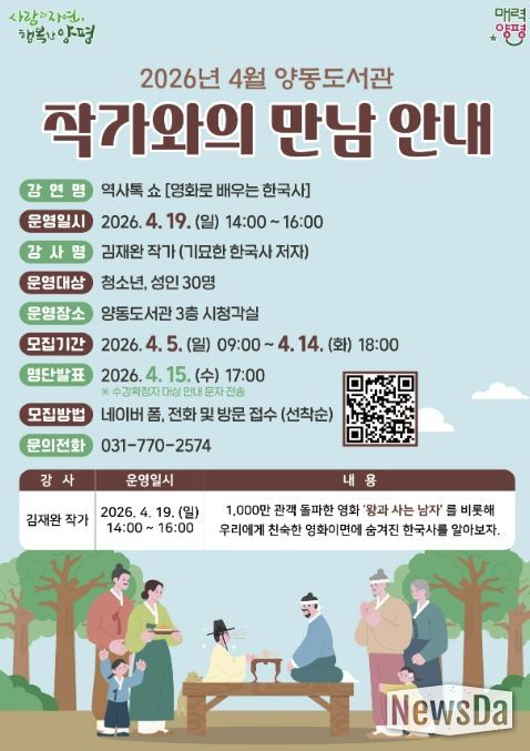 뉴스다 최광묵 기자 | 양평군은 4월 도서관 주간을 맞아 양동도서관에서 ‘작가와의 만남’ 프로그램 참여자를 4월 5일부터 14일까지 모집한다고 밝혔다.
