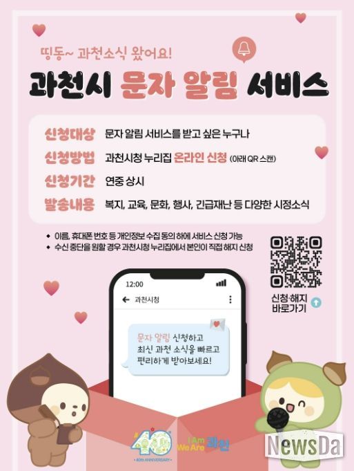 과천시 관계자는 “문자 알림 서비스를 통해 시의 다양한 소식을 시민들에게 적시에 제공되도록 소통을 강화해 나가겠다”라고 밝혔다.