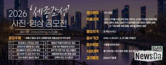 뉴스다 최광묵 기자 | 세종시문화관광재단(대표이사 박영국)은 세종시의 도시 일상 감성과 관광 매력을 담은 ‘2026 세종감성 사진영상 공모전’을 개최한다고 밝혔다.