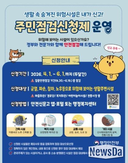 이번 제도는 2026년 집중안전점검 기간(4월 20일~6월 19일)에 맞춰 추진되는 것으로, 점검 대상을 주민들이 직접 선정함으로써 시민들의 안전의식을 높이고, 시설 노후화 등으로 인한 사고를 예방하는 것을 목표로 한다.