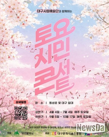 뉴스다 최광묵 기자 | 대구광역시는 시민들의 일상 속 문화예술 향유 기회를 확대하고 도심에 활력을 불어넣기 위해 오는 4월 4일 오후 7시, 수성못 수상무대에서 ‘2026 토요시민콘서트’의 막을 올린다.
