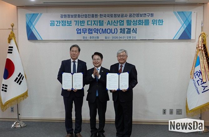 뉴스다 최광묵 기자 | 강원정보문화산업진흥원과 한국국토정보공사 공간정보연구원이 공간정보 기술과 디지털·AI 산업의 융합을 통한 지역경제 활성화와 관련 산업 진흥을 위해 업무협약을 체결했다. 이번 협약은 지역 중심의 공간정보 기반 디지털·AI 산업 활성화를 위한 협력체계를 확립하고, 양 기관의 전문성과 역량을 연계하기 위해 추진됐다.