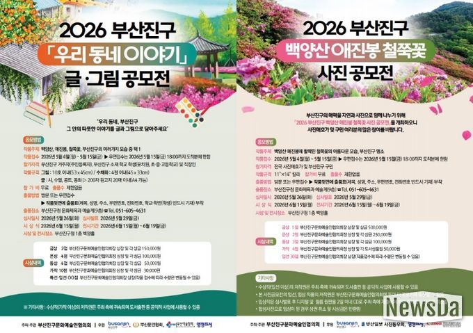 ‘백양산 애진봉 철쭉꽃 사진 공모전’은 전국 사진 애호가와 부산진구 구민을 대상으로 백양산 애진봉에 만개한 철쭉꽃의 아름다움을 담은 작품을 공모한다. 또한‘우리동네 이야기 글·그림 공모전’은 부산진구에 거주하거나 관내 학교에 재학 중인 초·중·고등학생을 대상으로, 부산진구의 다양한 모습을 주제로 한 글과 그림 작품을 자유롭게 출품할 수 있다.