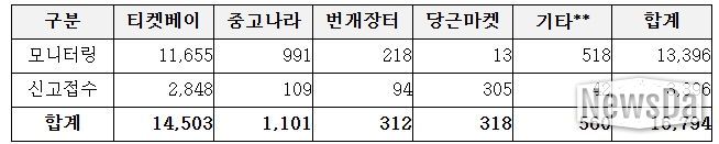 2026년 2월부터 3월까지 프로야구 암표 신고·모니터링 결과, 약 1만 6천여 건이 확인됐다. 특히 개막전(3. 28.~29.) 전후로는 정가 대비 최대 약 13배 고액 거래, 동일 계정 다량 좌석 확보 및 재판매 등 조직적 거래 정황이 다수 확인됐다. 이 중 다량·연석 판매, 과도한 웃돈 거래, 동일 계정 반복 거래 등 부정거래 의심 사례를 분석․파악해 경찰청에 수사를 의뢰했다.