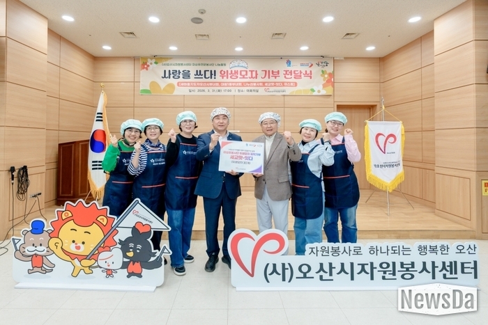 ▲자원봉사센터 미싱유전문봉사단 위생모자 기부 전달식