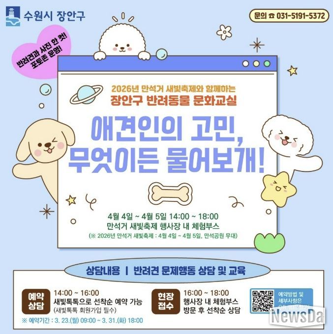 뉴스다 최광묵 기자 | 수원시 장안구가 4월 4일부터 5일까지 장안구 만석공원 내 체험부스에서 시민들을 대상으로 반려동물 문화교실을 추진한다.