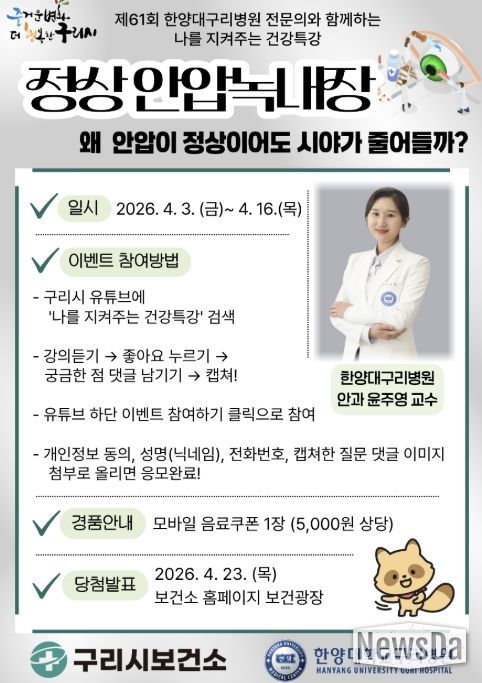 시민들은 4월 3일부터 16일까지 구리비전 채널을 통해 강의를 시청한 후 궁금한 사항을 댓글로 남기면, 우수질문 3건을 선정해 한양대구리병원 안과 윤주영 교수가 직접 답변할 예정이다. 또한 참여자 중 17명을 무작위로 선정해 총 20명에게 모바일 쿠폰을 증정한다.