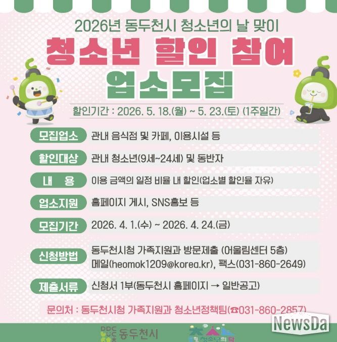 뉴스다 최광묵 기자 | 동두천시는 오는 5월 청소년의 날을 맞이하여 청소년 복지를 증진하고 지역경제를 활성화하기 위해 오는 5월 18일부터 5월 23일까지 6일간 ‘청소년 할인 주간’을 운영한다.